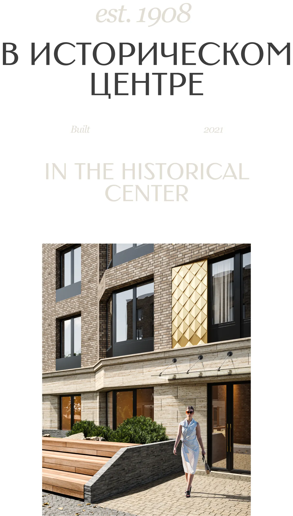 Вторым этапом мы создали сайт, рассказывающий о концепции, заложенной при строительстве дома, о сохранении архитектурного наследия и облика города. Мы решили рассказать об окружении здания, деталях архитектуры города, которые вошли в основу фасада клубного дома.