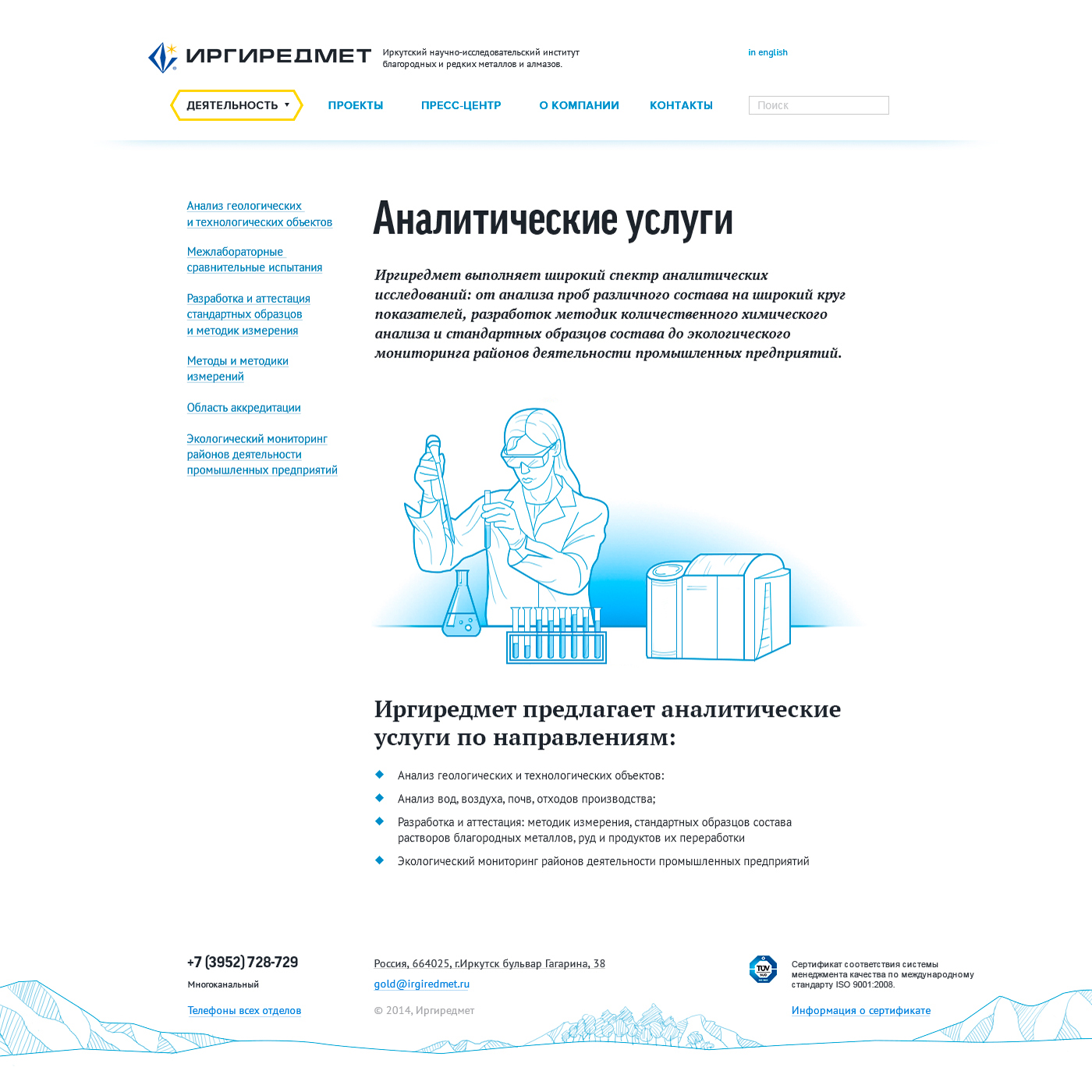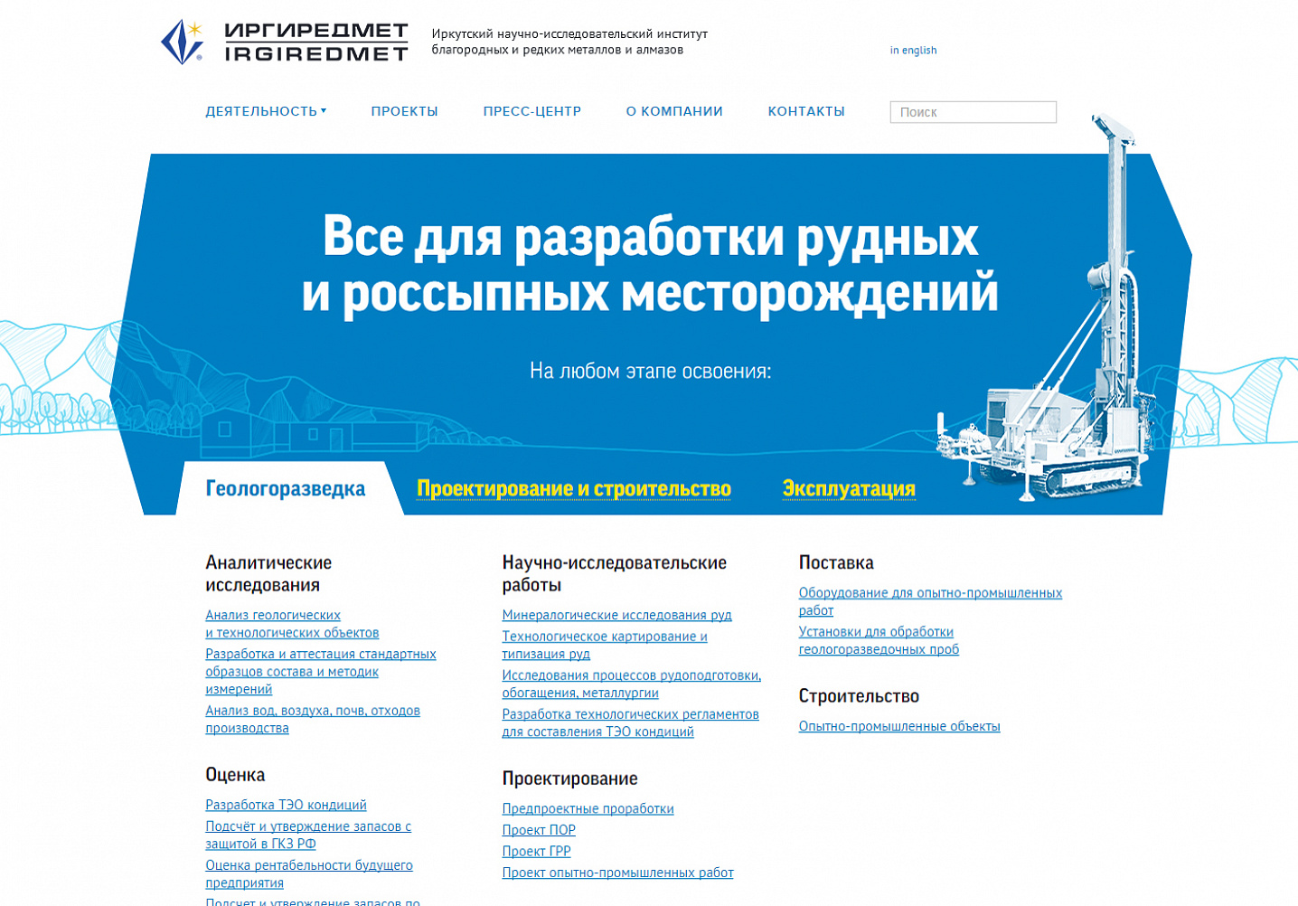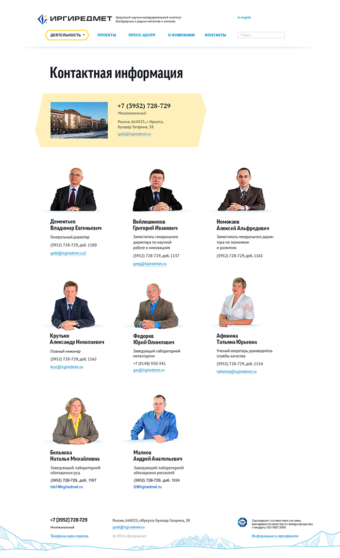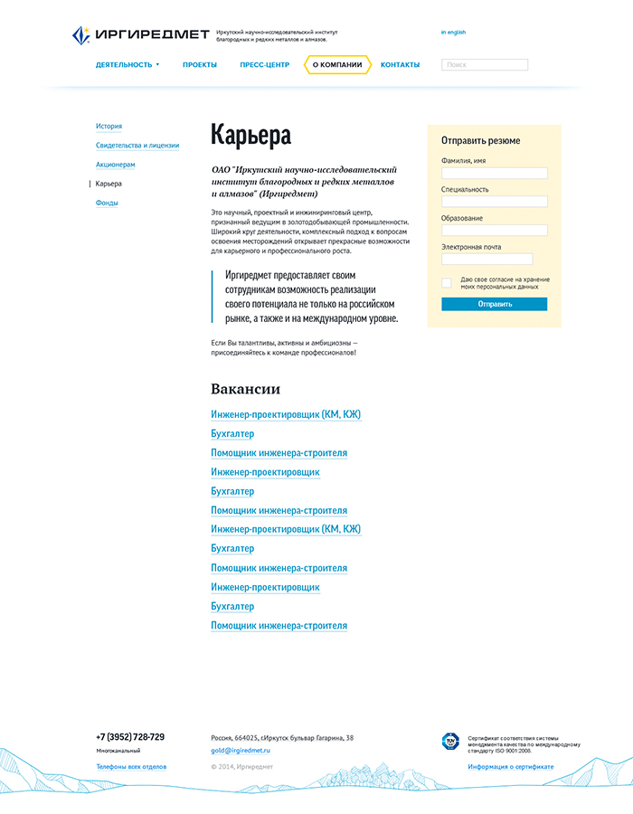 Перед нами стояла задача отобразить на сайте все направления деятельности компании, ее новости, филиалы, корпоративные ценности. В конечном счете у нас получился удобный, красивый сайт, подтверждающий статус компании Иргиредмет как лидера в своей области.