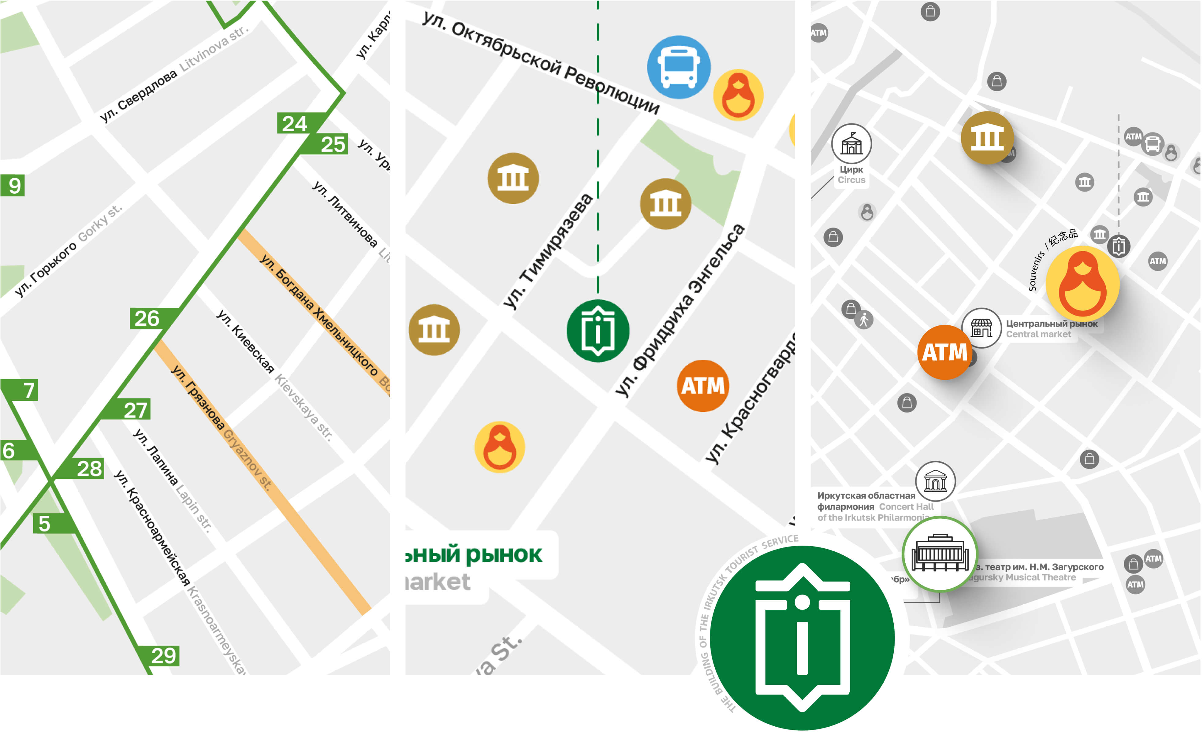 Обновили карту города для туристов, нарисовали яркую интерактивную карту для детей с уникальными иллюстрациями и сверстали два удобных путеводителя по Иркутску.