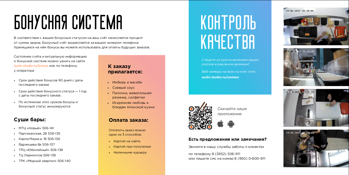 Глянцевый журнал очень хорошо попадал в женскую аудиторию, но создавал неправильные ожидания. Казалось, что цены в ресторане рассчитаны на состоятельных людей, а студентам здесь делать нечего. К тому же поддерживать такое меню было бы трудно: фотосессия с растениями требует большой подготовки, замена обложек и промополос выходила бы дороже. Кроме того, из-за листьев, использовавшихся как декорации, возникали ассоциации с другим иркутским рестораном.