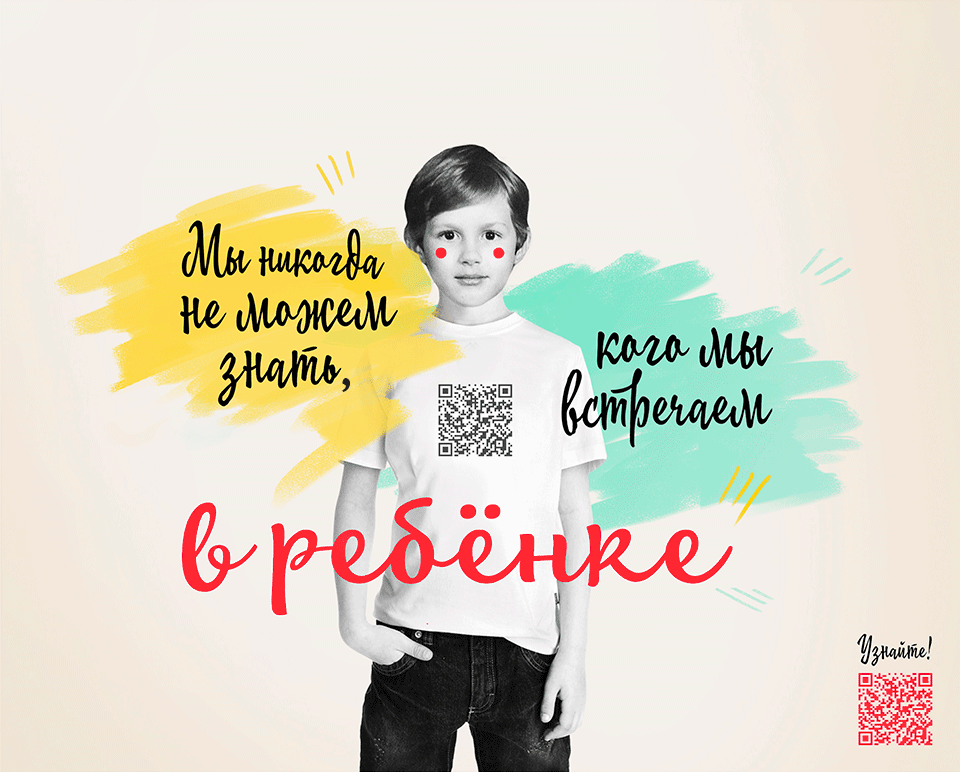 По QR-коду можно узнать, какой выдающийся человек вырос из ребенка, изображенного на плакате.