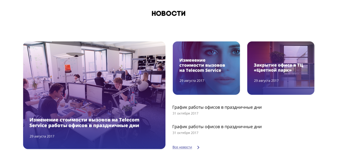 Блок с новостями уменьшает визуальную нагрузку на пользователя. Здесь представлены новости и готовые решения компании в упрощенном, текстовом виде.