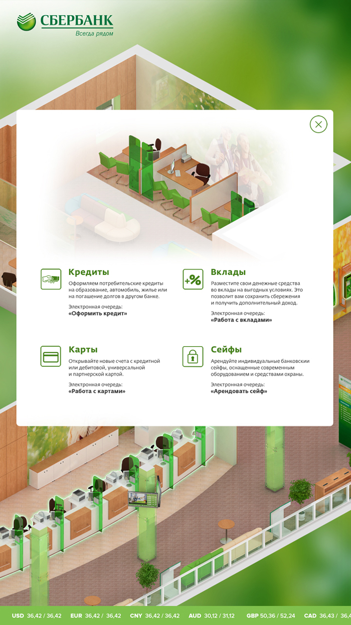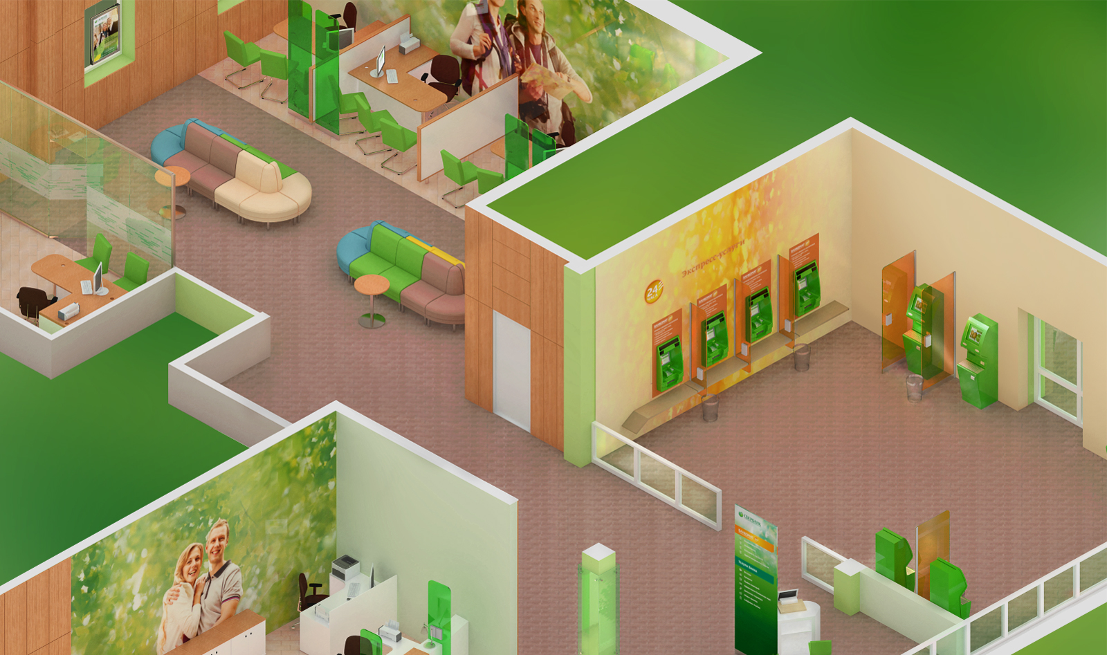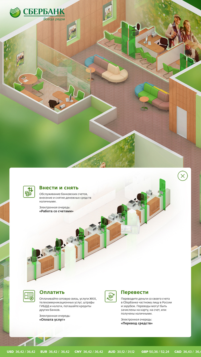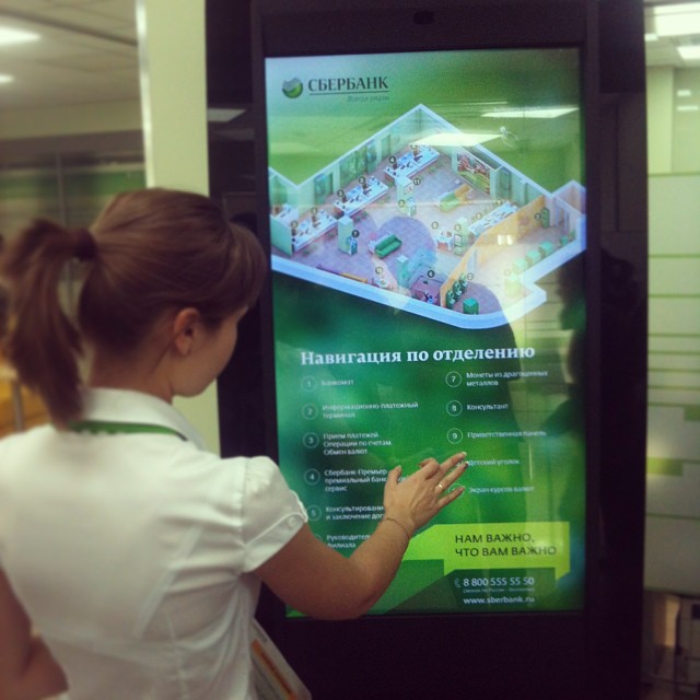 Байкальский банк Сбербанка России обратился к нам с интересной задачей — облегчить знакомство клиентов с внутренней навигацией отделений банка, используя для этого интерактивные навигационные панели. Вот что получилось.