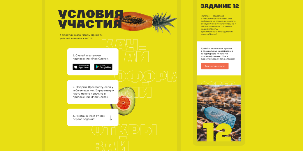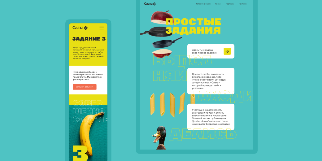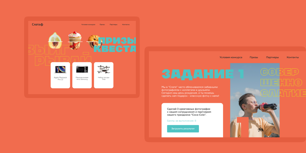 На сайт мы добавили эмоциональные фотографии людей, светлые, праздничные фотографии передавали атмосферу и настроение. Дополнили концепцию коллажами: порой они были смешными и даже абсурдными, это вызывало ещё больше внимания и желания остановиться на сайте и разглядеть их внимательнее. Яркий и сочный сайт стал стартовой площадкой квеста: на нём пользователи получали всю информацию и отправлялись в приложение, где их ждали задания.
