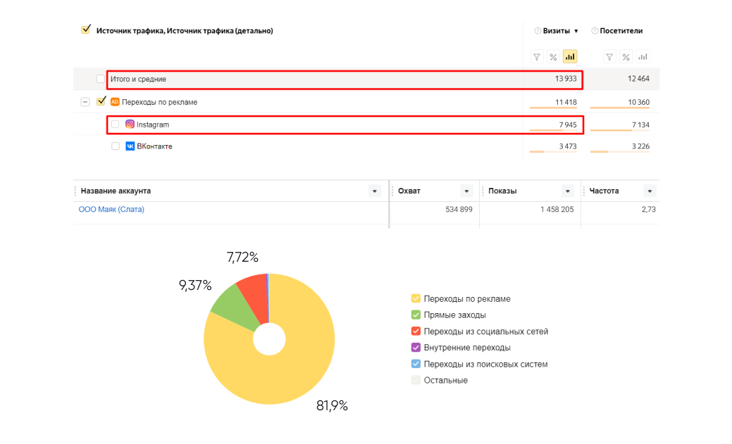 82% трафика – переходы по рекламе из Instagram, почти 8% - это переходы из социальных сетей, которые были простимулированы рекламной кампанией. Оставшийся трафик - это прямые заходы и заходы из поисковых систем.